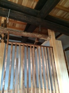 ここの古民家の「再築」の現場はこれから仕上げに入る。 ダイナミックな柱や梁をいぶしたような色に塗って、壁は白く漆喰で仕上げる。