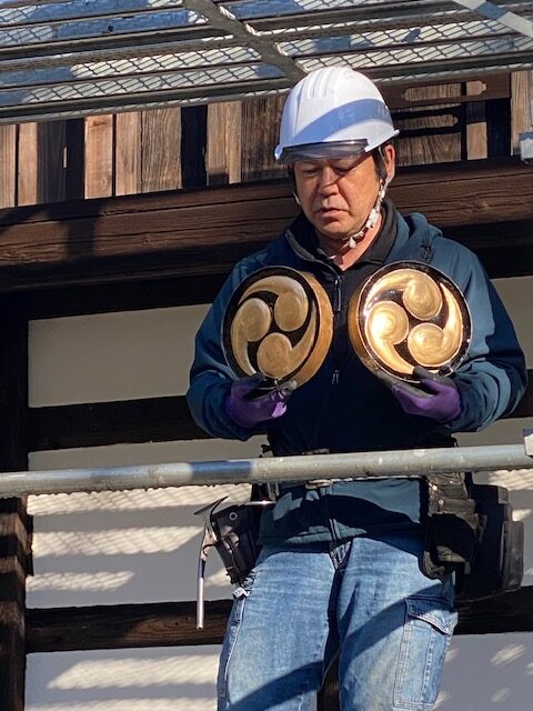 先日、屋根の棟(ぐし)に、山川家の家紋「左三つ巴」を2つ取付けました。