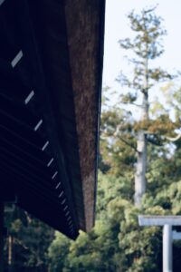 伊勢神宮の造りの特徴は、天高く伸びる「千木」、御屋根に並ぶ「鰹木」、古代の佇まいを今に伝える神明造。
